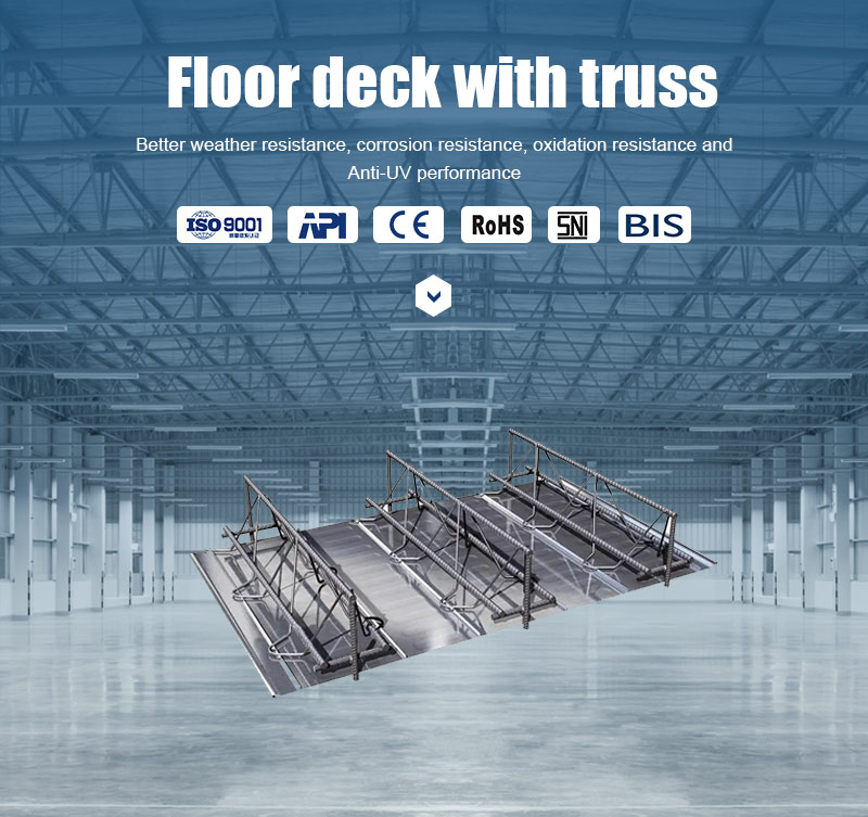 Truss floor support plate, also known as reinforcement truss formwork, is a combined structural system formed by processing the main stressed reinforcement in the floor slab into reinforcement truss with special equipment in the factory, and then welding the reinforcement truss and galvanized steel plate into one. In the construction stage of structural floor slab, the system replaces the construction formwork with galvanized steel plate, and bears the dead weight of floor slab concrete and construction load together with the truss structure formed by welding reinforcement in the structure. After pouring concrete, a reinforced truss concrete floor slab is formed, which bears the service load in the service stage.