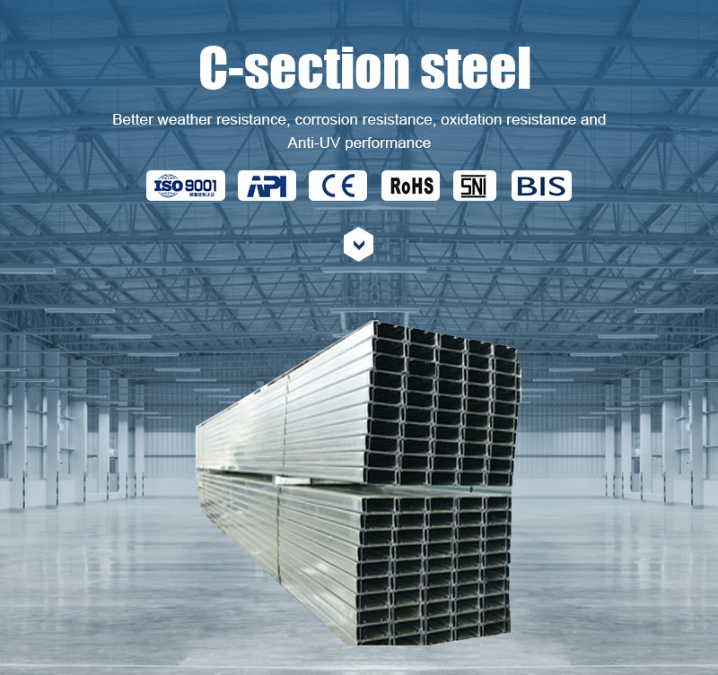 C-section steel is automatically processed and formed by C-section steel forming machine. C-section steel forming machine can automatically complete the forming process of C-section steel according to the given size of C-section steel. C-shaped steel purlins are divided into five specifications: 80, 100, 120, 140 and 160 according to different heights. The length can be determined according to the engineering design, but considering the conditions of transportation and installation, the total length is generally no more than 12m